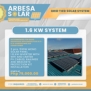 3 pcs. 530W Mono Solar Panel1.6 KW Inverter with WiFi & LimiterPV Cables, Railings & BracketsProtection KitInstallation
